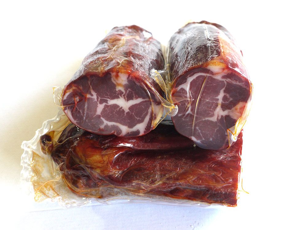 Ingredientes: Carne de aguja de cerdo (cruce raza Duroc), sal, pimentón, conservadores y ajo.